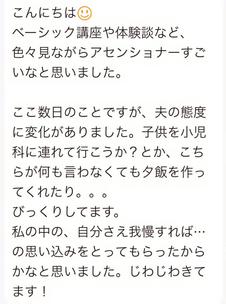 仕事はもちろん、夫婦関係まで改善し会話の質まで変わりました。ここまで最短で結果の見えるセッションを私は知りません。